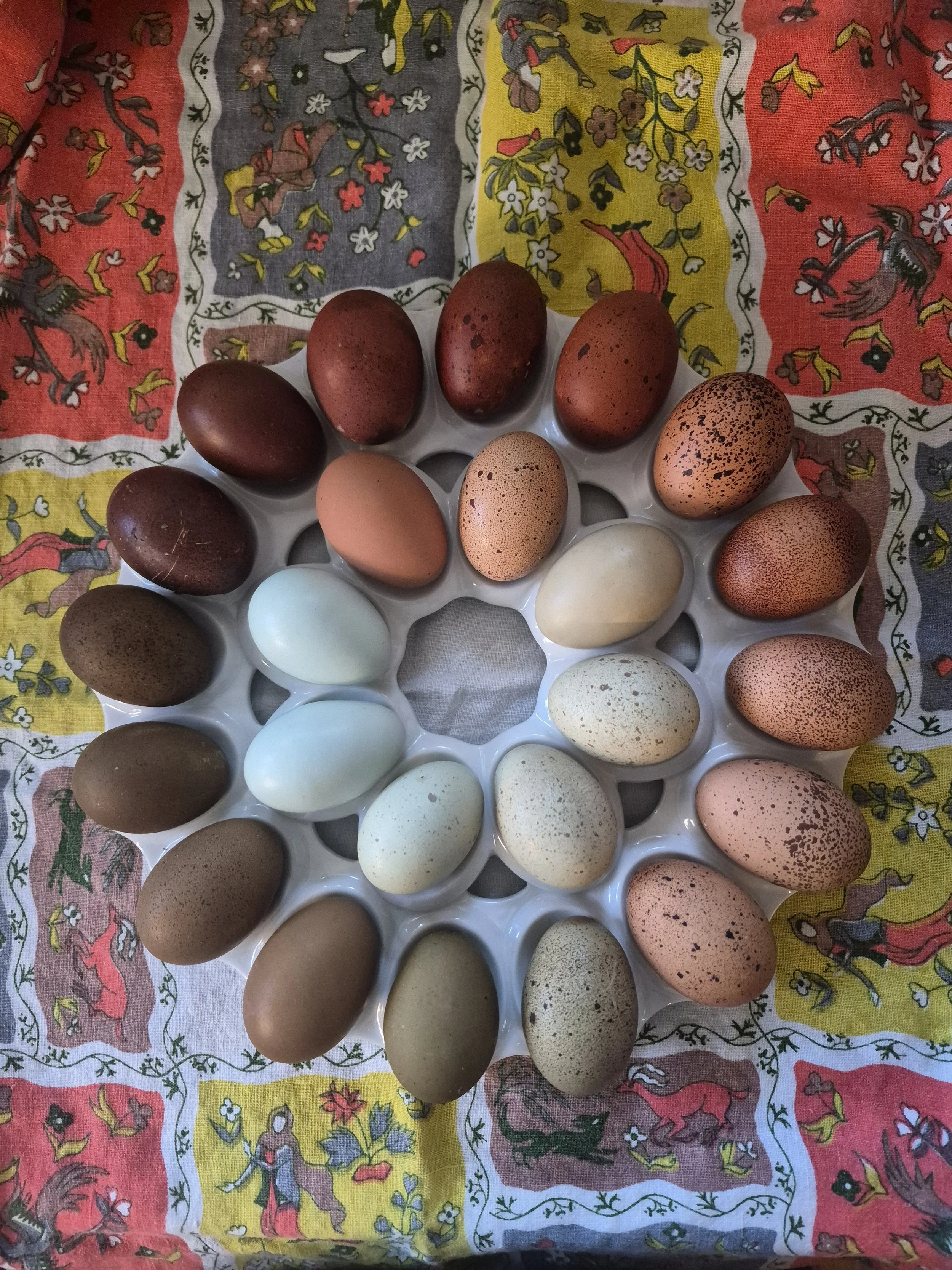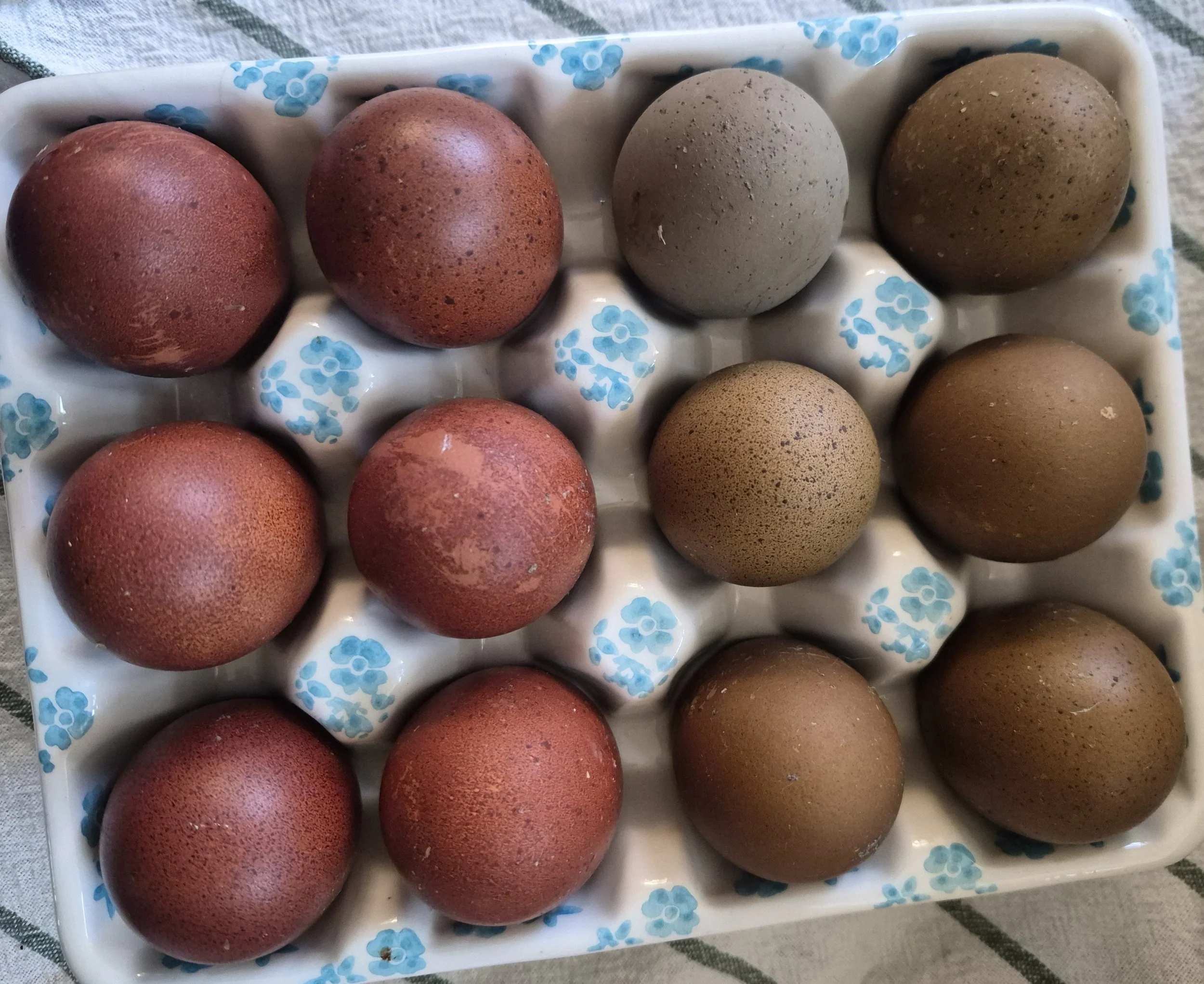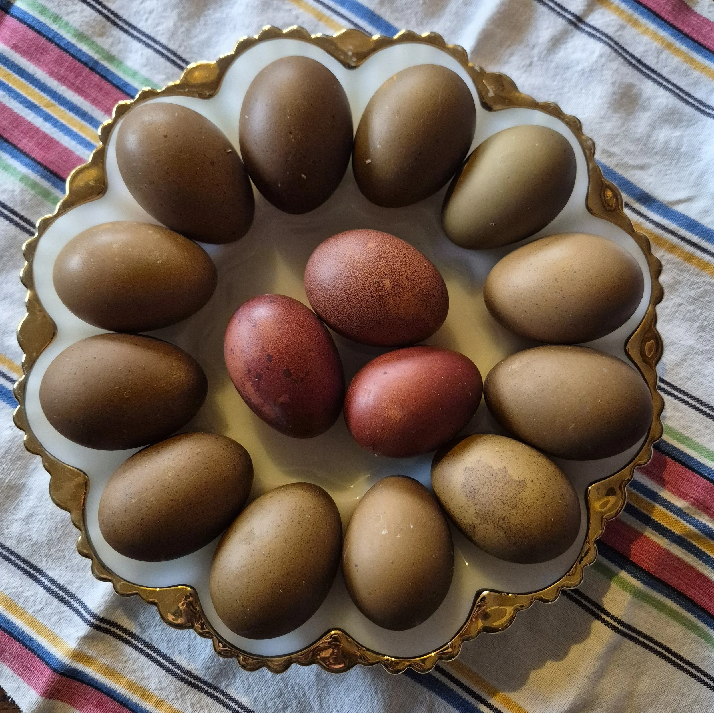 Our dark and dreamy eggs showcase the richest, most dramatic tones in our flock; this collection may include deep chocolate browns, rich terracottas, and earthy mossy greens with incredible depth of color. These beauties may include purebred Black Copper Marans, or by our multigenerational, backcrossed Olive Egger hens. Each carton is a moody, luxurious collection of our very darkest eggs and may include dark speckles.